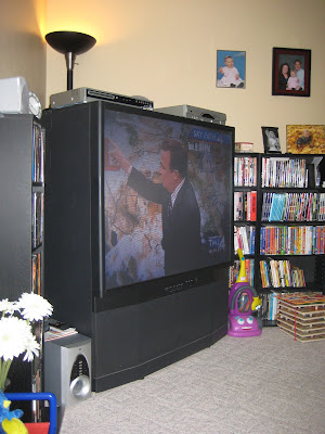 Anyways… we were also offered a 50-inch projection screen television, but I knew we wouldn’t have room in our minivan to put the tv, so I politely declined. When we arrived to pick up the dresser, we were once-again offered the tv and we made the attempt to fit it in the van along with the dresser.