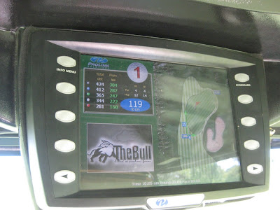 We walked inside and turned in our coupons and were shown to our cart where our bags were already placed! I was further-impressed with the on-board GPS & digital scorecard built into the ceiling of our cart! How cool?!